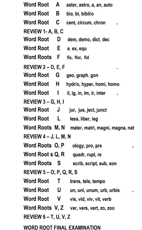 | act do, act | aero air | ambul walk, move | andro man, male | cert certain, sure | chrono time | cline lean | col together, jointly | com together, common | cogi know |