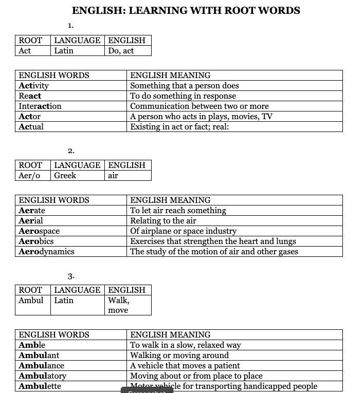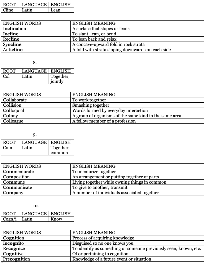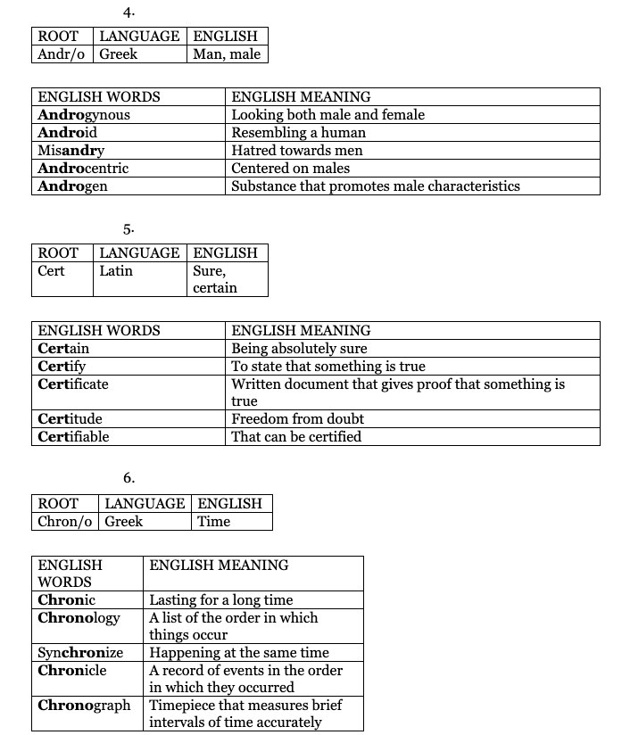 | act do, act | aero air | ambul walk, move | andro man, male | cert certain, sure | chrono time | cline lean | col together, jointly | com together, common | cogi know |